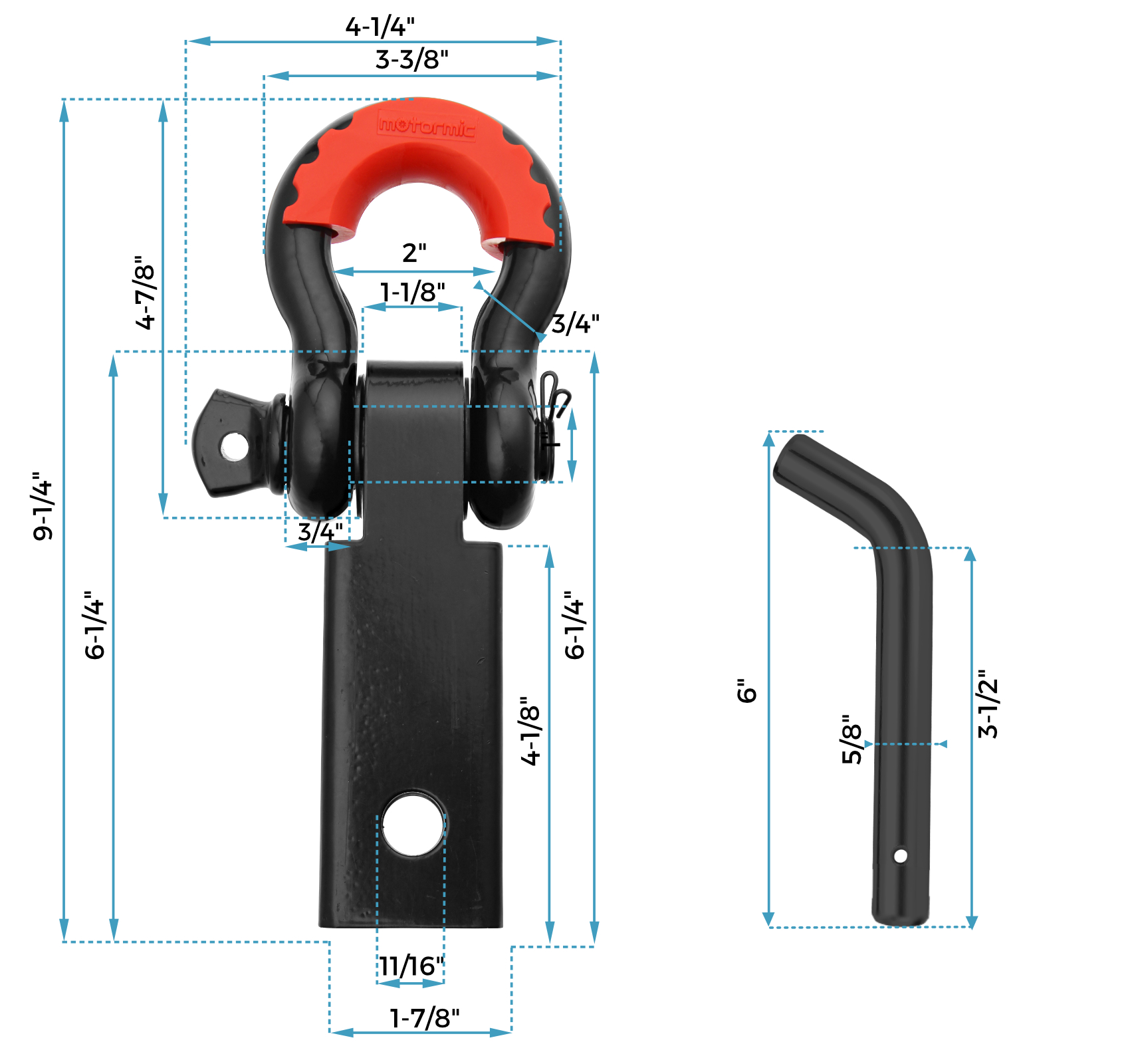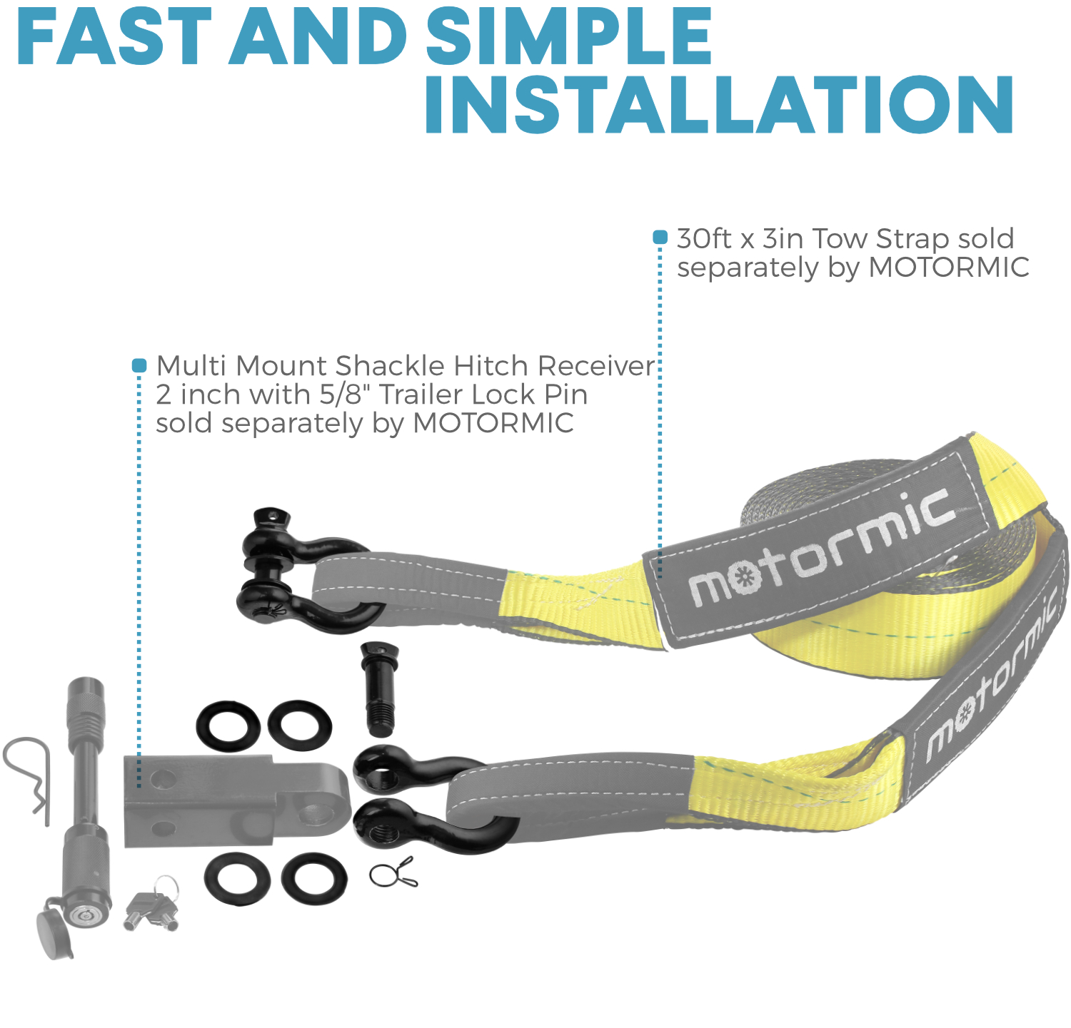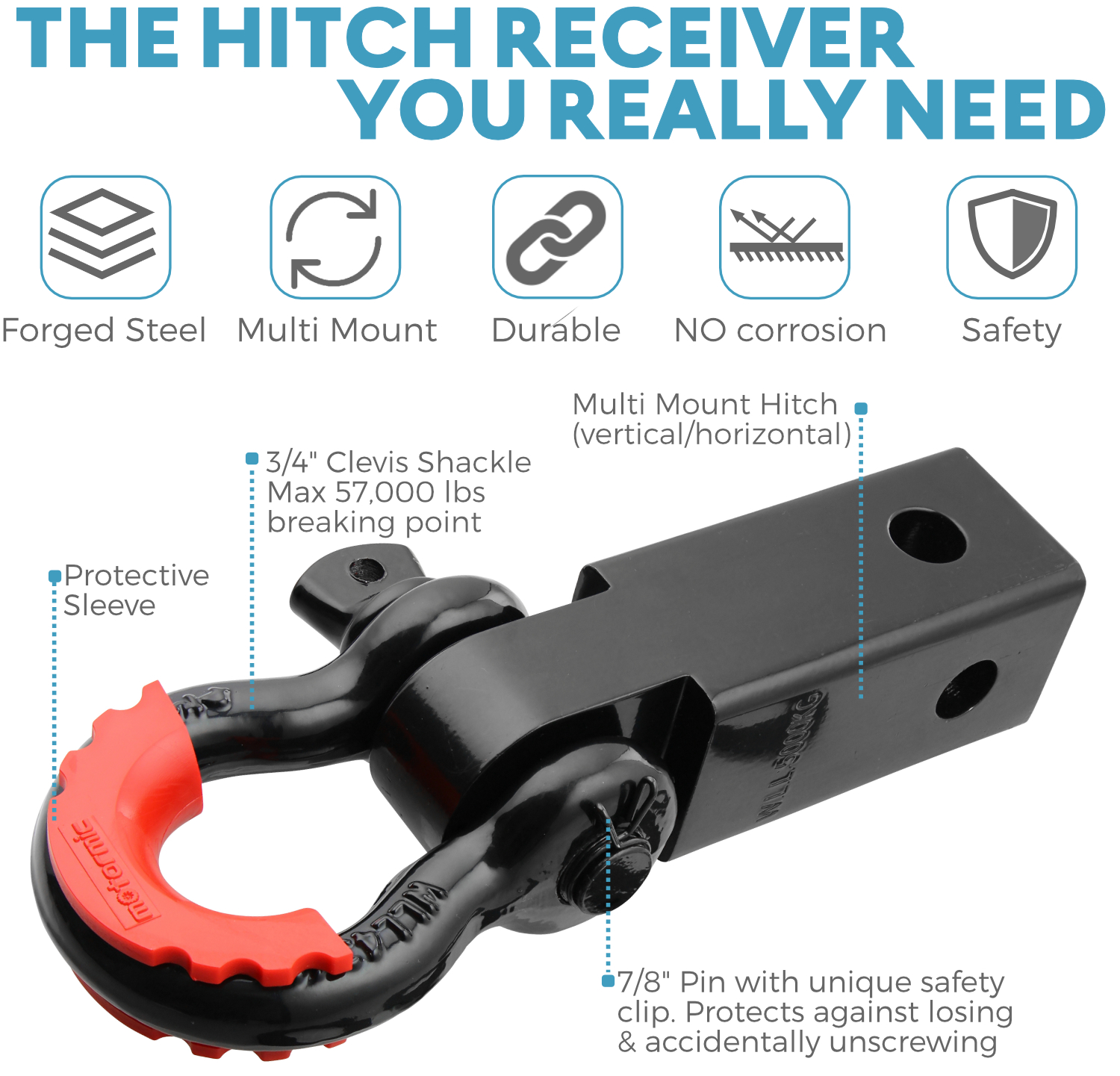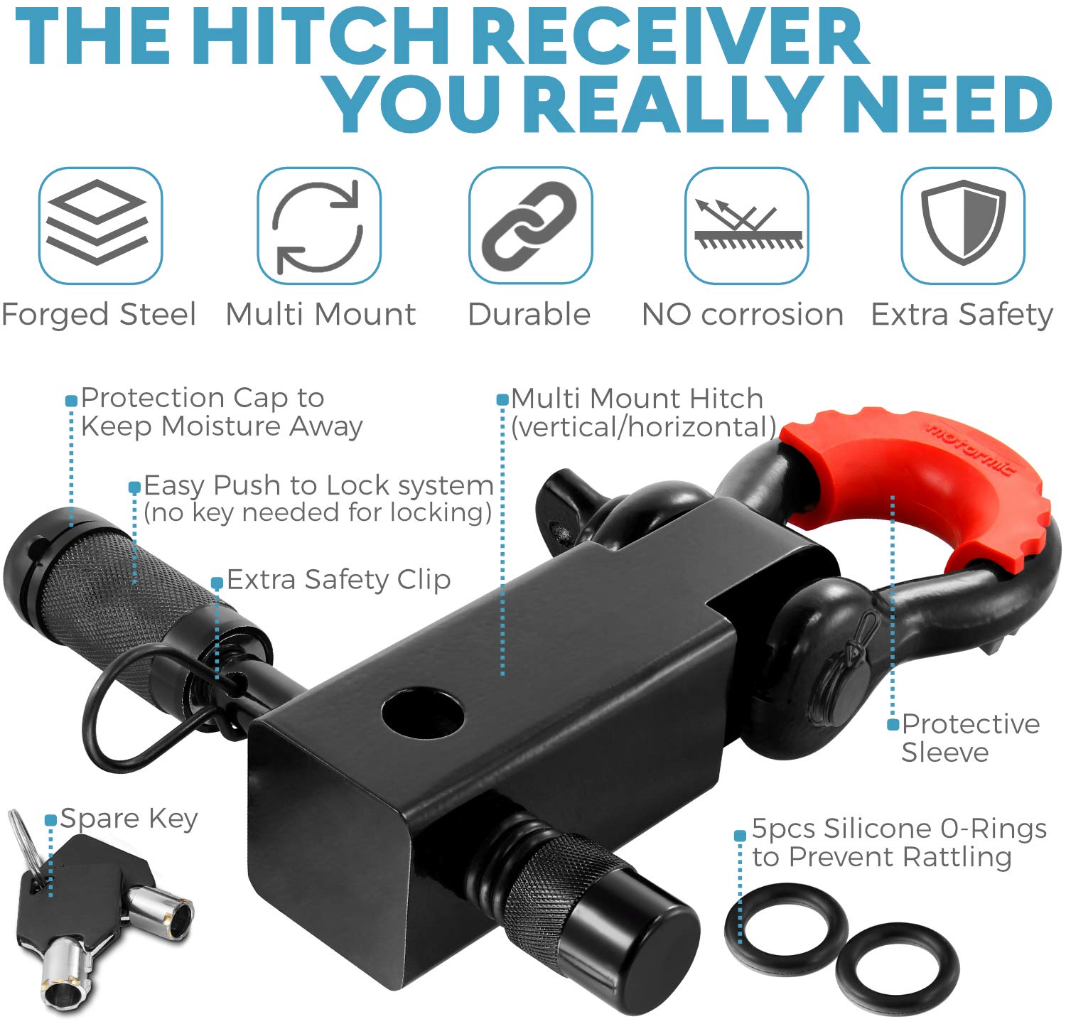 - MULTI-MOUNT DESIGN: The 2-inch Receiver Hitch by MOTORMIC is designed to allow the ¾-inch D-Ring to swing horizontally or vertically for extensive recovery anchor point options.