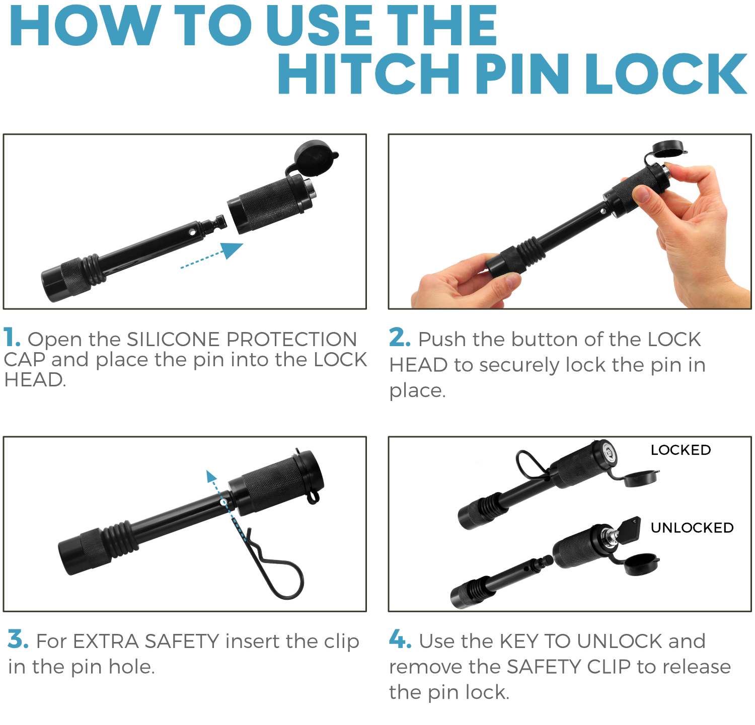 - MAKES YOUR VEHICLE MORE SECURE: 1/4 turn innovative lock and push lock design makes the hitch pin to quickly open and lock. 5/8″ pin made from one piece for added resistance.