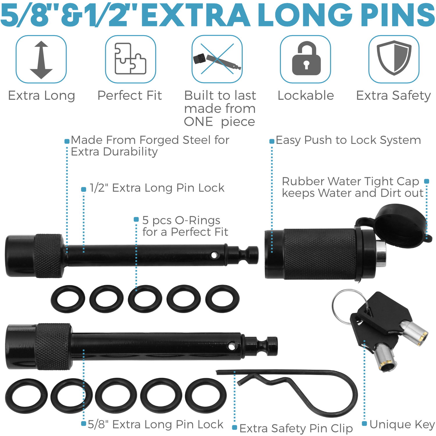 - EXTRA LONG 5/8″ HITCH LOCK PIN perfect for any type of 2″ and 2 1/2″ receivers