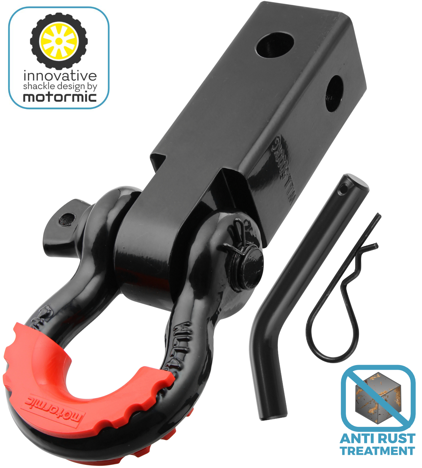Motormic Shackle Hitch Receiver for 2-Inch Receivers with 3/4″ D-Ring Black Powder Coated (11,000 lbs. Capacity) + Red Silicone Isolator + 5/8″ Hitch Pin AND EXTRA Clip, Ideal for towing Cars, Trucks, Atv, Boats